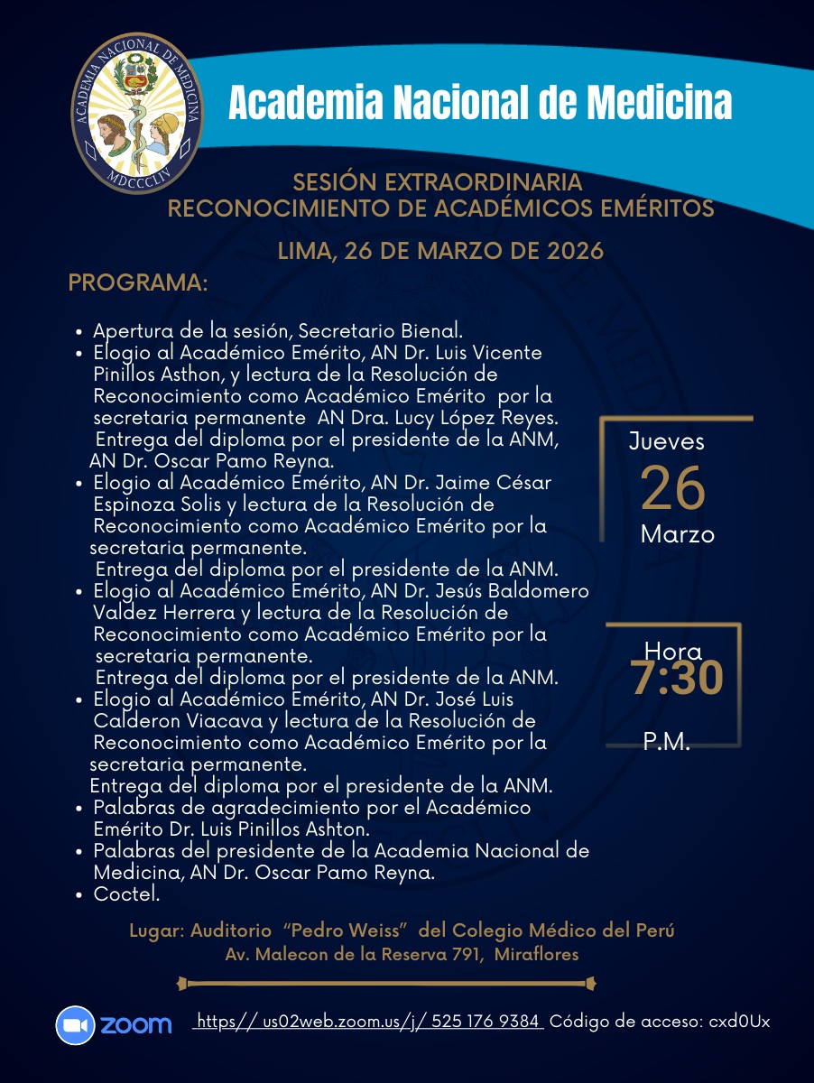 Tenemos el agrado de invitarlos cordialmente a participar de la Sesión Extraordinaria de Reconocimiento como Académicos Eméritos de los Dres.  AN Luis Vicente Pinillos Asthon, AN Jaime Cesar Espinoza Solis, AN José Luis Calderon Viacava y AN Jesús Baldomero Valdez Herrera, que tendrá lugar el jueves 26 de marzo, a las 7:30 p.m. en el Auditorio “Pedro Weiss” del Colegio Médico, Malecón de la Reserva 791, Miraflores.